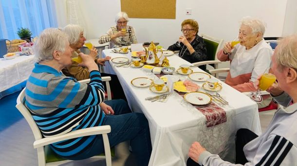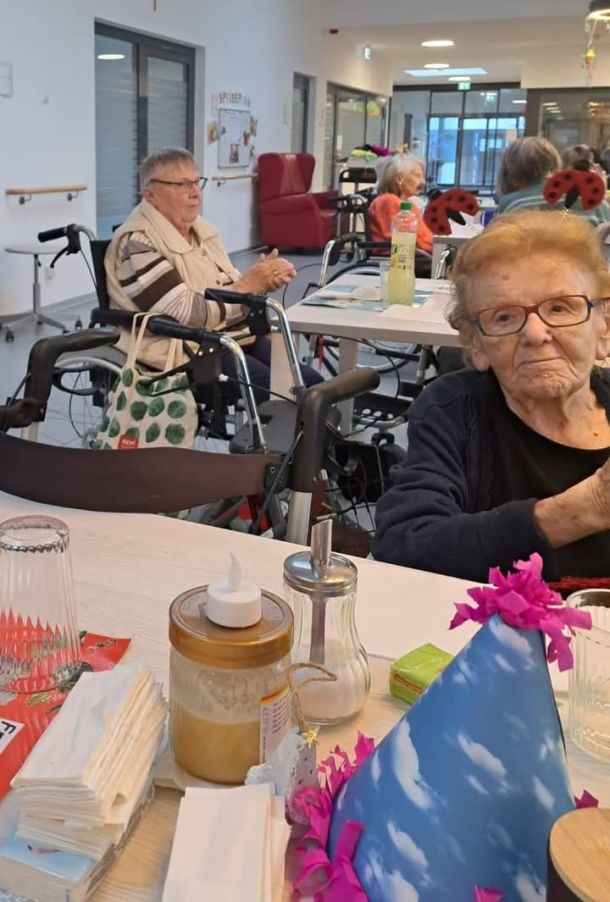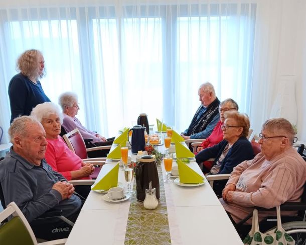 🤗So beginnt der Tag doch schon mal sehr gut - BewohnerSektFrühstück🥂🥨🧀🫖☕️ mit GeburtstagsKind Linda🥳; Helmut spielt dazu gekonnt ein Ständchen für sie und die anderen Damen.